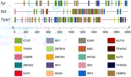 In this study, 750, 707, and 763 types of transcription factors were predicted in the promoter regions of the TYR, TYRP1, and DCT genes, respectively. The top 20 transcription factors were selected for visualization and analysis. CTCF accounted for the largest number of transcription factors. The transcription factors of the TFAP and KLF family were the most diverse. Among these, TFAP2A, TFAP2C, and KLF4 are associated with the development and function of melanogenesis (Figure 7).