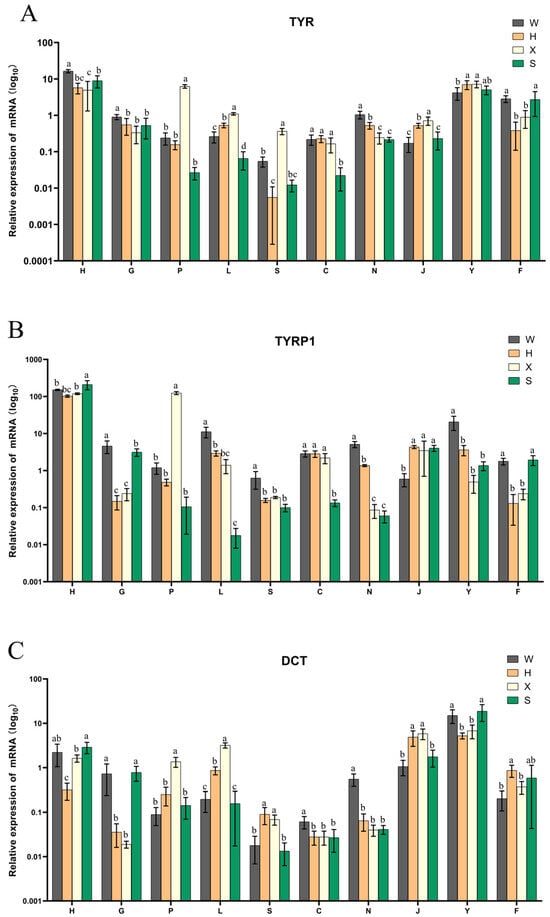 Differential expressions of (A) TYR, (B) TYRP1, and (C) DCT in four kinds of P. sinensis. The four individuals are referred to as the Qingxi black strain (W), Yongzhang golden strain (H), albino strain (X), and Huangsha strain (S). The ten tissues are coded as heart (H), liver (G), spleen (P), lung (L), kidney (S), intestine (C), brain (N), muscle (J), eyes (Y), and skin (F) tissues. In the bar chart, means labeled with different lowercase letters indicate a significant difference (p < 0.05), whereas means labeled with the same lowercase letters are not significantly different.