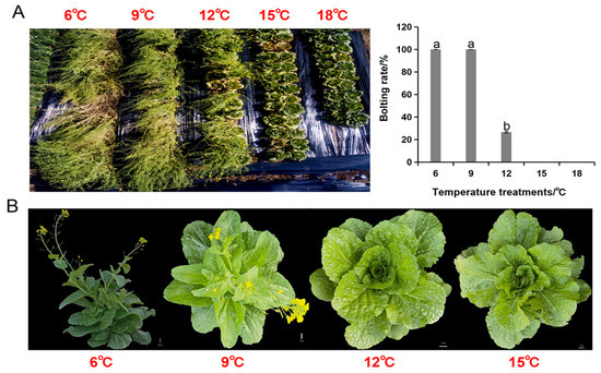 The analysis of the field-grown treatment groups showed that bolting rate was zero for the plants that had been pretreated with >15 °C temperature. Therefore, four temperature conditions (6 °C, 9 °C, 12 °C, and 15 °C, with 15 °C taken as non-vernalization or control temperature treatment) were selected for RNA-Seq analysis to identify genes associated with vernalization tolerance in Chinese cabbage (Figure 1B).