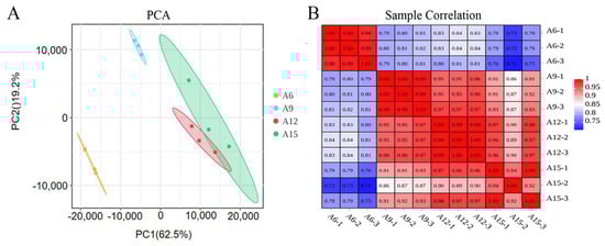 Figure 2. Intersample analysis of 12 leaf tissue samples used for RNA-seq. (A) PCA, where there are relative coordinate points on the principal component after the samples are analyzed by dimension reduction. The distance of each sample point from the other represents the relatedness or closeness of that sample to the other. (B) Analysis of correlation coefficients between samples.