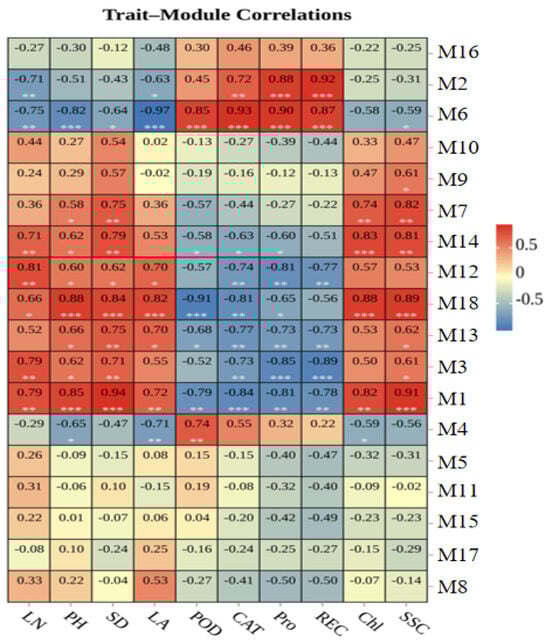 Figure 7. The module–trait relationships of genes involved in phenotypic and physiological traits.