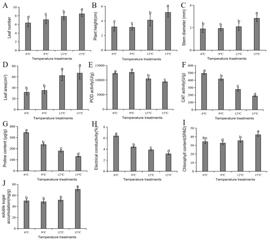 Figure 8. Phenotypic and physiological responses of Chinese cabbage cultivar LY2 to different cold (low temperature) stress conditions. (A) Leaf number; (B) plant height; (C) stem diameter; (D) leaf area. (E) POD activity; (F) CAT activity; (G) proline content; (H) electrical conductivity; (I) chlorophyll content; and (J) soluble sugar accumulation. Data are presented as mean ± SE of mean (n = 10). Different letters above bar graphs show significant difference (p < 0.05) between or among different temperature treatments.