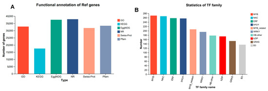 Gene annotation and transcription factor identification statistics. (A) Gene annotation statistics for 6 major databases. (B) Statistics on the number of major transcription factor families.