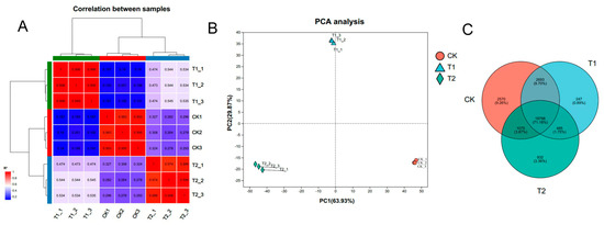 To assess the quality and usability of the transcriptome data, we examined the correlation among individual samples within the dataset, as depicted in Figure 3. The heatmap illustrating sample correlations reveals that the correlation coefficient between biological replicates exceeded 97%, while notable differences were observed between samples from distinct treatment groups (Figure 3A). Furthermore, the results of the principal component analysis (PCA) demonstrated that biological replicates were clearly grouped within the same cluster (Figure 3B). A Venn diagram analysis of expressed genes across the three treatment samples (CK, T1, and T2) indicated that 19,766 genes were commonly expressed in all three groups. In contrast, 2570, 247, and 932 genes were uniquely expressed in the CK, T1, and T2 samples, respectively, potentially serving as key genes in the heat stress response (Figure 3C).
