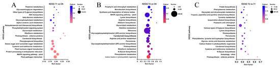 KEGG enrichment analysis of differentially expressed genes among transcriptomes. (A) List of the top 20 metabolic pathways after KEGG enrichment analysis of DEGs in the T1 vs. CK group. (B) List of the top 20 metabolic pathways after KEGG enrichment analysis of DEGs in the T2 vs. CK group. (C) List of the top 20 metabolic pathways after KEGG enrichment analysis of DEGs in the T2 vs. T1 group.