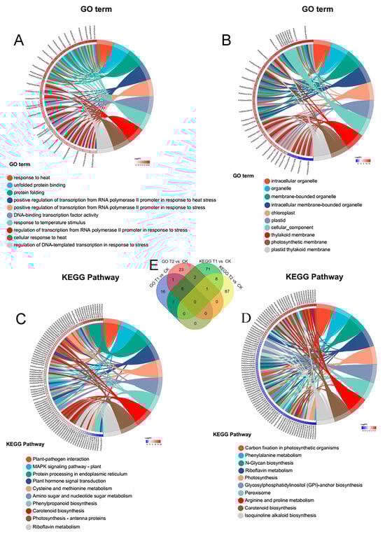 GO and KEGG gene set enrichment chordal maps with Venn analysis. (A) GO enrichment analysis and top genes screened in T1 vs. CK group. (B) GO enrichment analysis and top genes screened in T2 vs. CK group. (C) KEGG enrichment analysis and top genes screened in T1 vs. CK group. (D) KEGG enrichment analysis and top genes screened in T2 vs. CK group. (E) Venn analysis of gene sets after GO and KEGG enrichment analysis in T1 vs. CK and T2 vs. CK groups. Detailed information can be found in Tables S6 and S7.