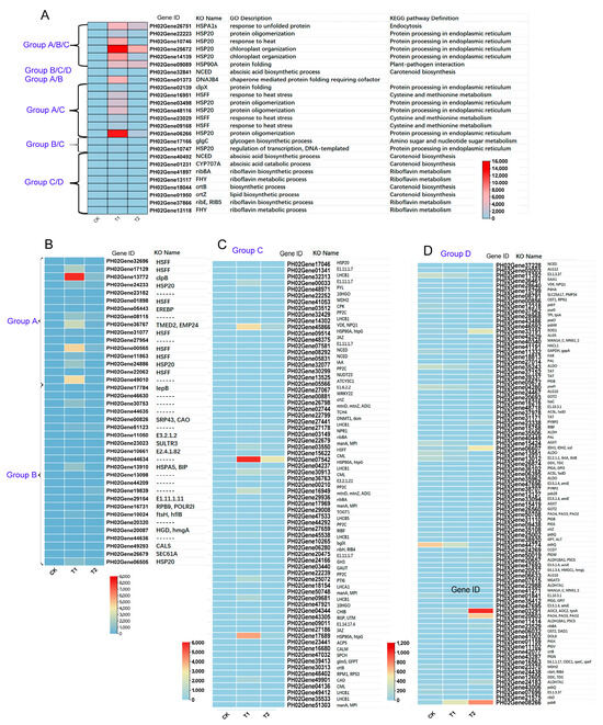 To elucidate the significance and accuracy of the metabolic pathways, cellular components, and key genes identified in Figure 7, we examined the changes in the expression levels of the top 100 genes exhibiting the most pronounced alterations across different subgroups using transcriptome data. As depicted in Figure 8, the 16 genes shared by both GO and KEGG enrichment analyses predominantly belonged to the HSP, HSF, and NCED gene families (Figure 8A). The remaining genes were homologs of EREBP, HSP, CPK, and JAZ genes (Figure 8B–D), which are implicated in biological processes such as cellular response to heat stress, hormone signaling transduction, and secondary metabolite synthesis.