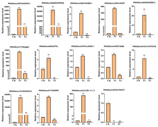 To validate the expression accuracy of the key genes identified in Figure 8 and RNA-seq analysis, we randomly selected 14 key differentially expressed genes for qRT-PCR validation. These genes, which are affiliated with diverse cellular components and metabolic pathways (as listed in Table S10), include HSP20 (PH02Gene25672), HSP20 (PH02Gene14139), HSP90A (PH02Gene09089), NCED1.1 (PH02Gene32841), HSFF (PH02Gene16951), glgC (PH02Gene17166), PYL (PH02Gene00033), NPR1 (PH02Gene27178), E1.11.1.7 (PH02Gene32313), bglX (PH02Gene10265), LHCB1 (PH02Gene27441), LHCB1 (PH02Gene32429), TOGT1 (PH02Gene36763), NCED1.2 (PH02Gene40492), CYP707A (PH02Gene01231), and ribBA (PH02Gene41897). These genes are implicated in metabolic pathways such as protein processing in the endoplasmic reticulum, plant–pathogen interaction, plant hormone signal transduction, phenylpropanoid biosynthesis, carotenoid biosynthesis, and photosynthesis-antenna proteins, all of which are intricately linked to cellular metabolism and responses to adversity stress. The qRT-PCR results further substantiate their significance in the heat stress response process and confirm the accuracy of the RNA-seq analysis of bamboo (Figure 9). This study offers a novel perspective for the cultivation of stress-resistant bamboo varieties.