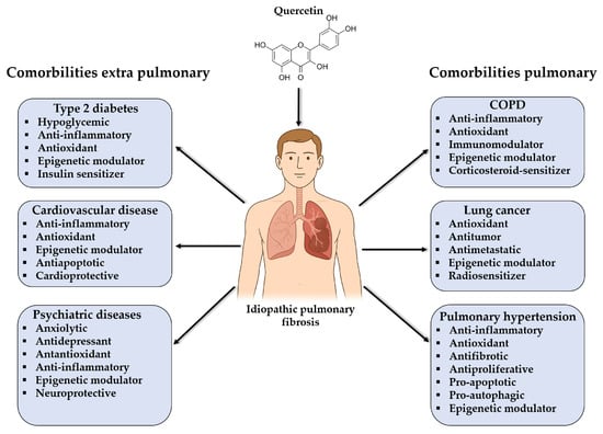 Illustration of pleiotropic therapeutic effects of quercetin on pulmonary and extrapulmonary comorbidities associated with IPF.