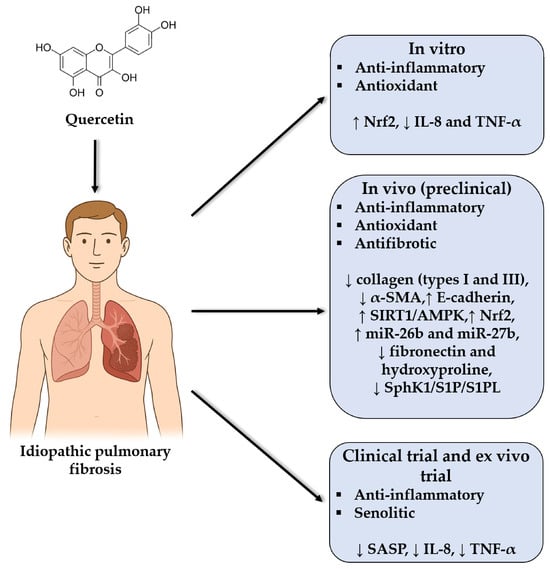 Schematic representation of the main therapeutic effects, signaling pathways and target molecules modulated by quercetin in in vitro, in vivo, ex vivo models and clinical trials in the context of idiopathic pulmonary fibrosis (IPF). The symbol “↓” indicates downregulation, and “↑” indicates upregulation.
