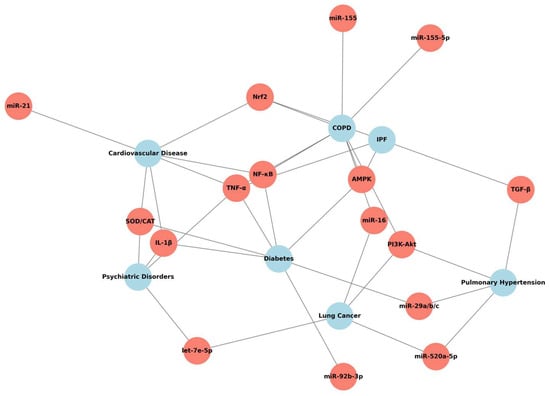 Quercetin targeting key molecular pathways of biomarker networks involved in IPF and comorbidities. Red circles represent proteins and miRNAs modulated by quercetin which are involved in IPF, and its comorbidities are represented in blue circles.