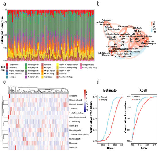 Immune landscape characterization in GBM. (a) CIBERSORT-derived histogram of 22 immune cell fractions in GBM. (b) Immune cell interaction network in GBM. (c) Heatmap depicting immune cell distribution across GBM cases. (d) Cumulative plots of ESTIMATE and xCell-calculated immune/stromal scores in the GBM cohort.