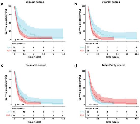 GSE16011 GBM survival analysis via Kaplan–Meier by score type. (a) Immune scores; (b) stromal; (c) estimates scores; (d) tumor purity scores.
