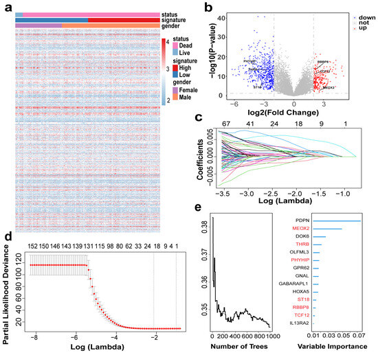 Construction of risk model based on GBM cohort: (a) Heatmap showing gene distribution and clinical information of the cohort; (b) Volcano plot showing differential gene expression. Up (red): upregulated genes (logFC > 2, p-value < 0.05); Down (blue): downregulated genes (logFC < −2, p-value < 0.05); Not (grey): non-significant genes. (c,d) Llasso Cox model analysis identified 22 genes. The different colors of the curves represent the changes in coefficients of different genes. (e) RF analysis (left) evaluated prediction error rates across decision trees to determine model convergence , while variable importance scores (right) identified the top 14 survival-associated genes (final selected MEOX2, PHYHIP, RBBP8, ST18, TCF12, and THRB, highlighted in red).