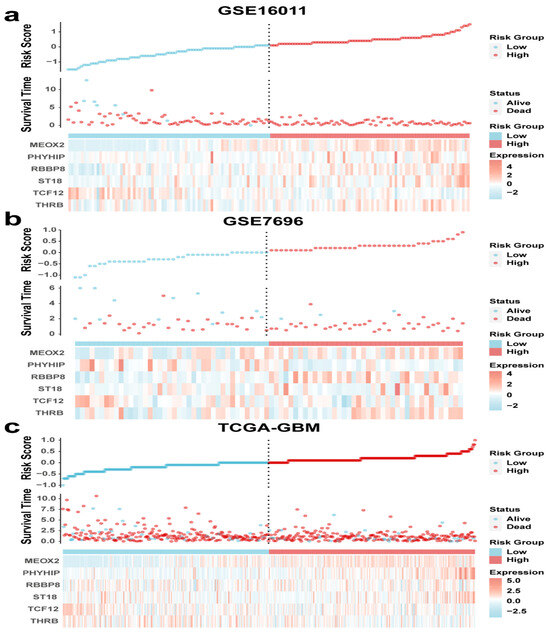 Risk score curves, survival time and survival status scatter plots, and clustering heat maps for (a) GSE16011, (b) GSE7696, and (c) TCGA-GBM.