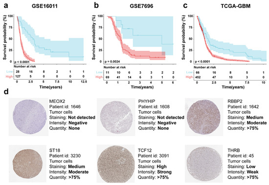Risk score-based KM survival curves for the patient cohorts (a) GSE16011, (b) GSE7696, and (c) TCGA-GBM. (d) Protein expression of MEOX2, PHYHIP, RBBP8, ST18, TCF12, and THRB in tumor tissues in the HPA database.