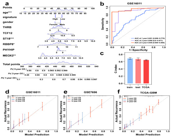 Individual integrated prognostic model construction. (a) A prognostic nomogram consisting of clinical information and genes together, predicting survival by score for different years. * p < 0.05, ** p < 0.01, *** p < 0.001. (b) GSE16011Time-ROC curves of 1, 3, and 5 years AUC. (c) C-index values of training (GSE16011), test (GSE7696), and TCGA data. (d–f) Calibration curves of GSE16011, GSE7696, and TCGA-GBM, where the red, blue, and purple lines are the one-year, three-year, and five-year projections, respectively.