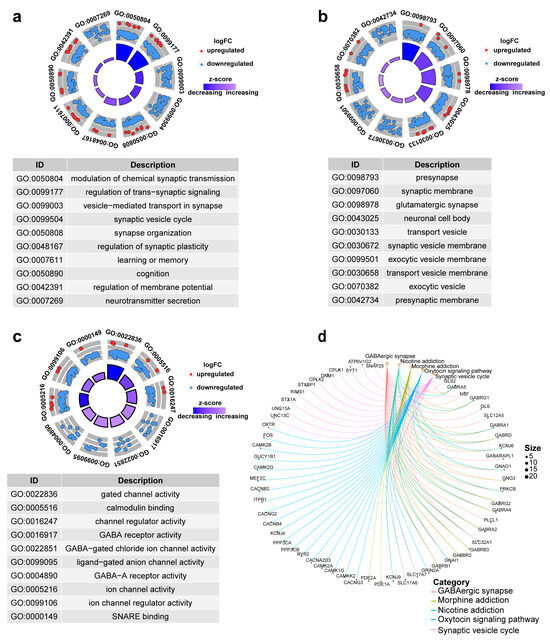 To elucidate the biological significance of differentially expressed genes (DEGs), we conducted GO and KEGG pathway analyses. Figure 7a–c respectively displays the top 10 enriched terms in biological processes (BPs), cellular components (CCs), and molecular functions (MFs). Among them, modulation of chemical synaptic transmission, presynapse, and gated channel activity are the most noteworthy results. Figure 7d is the KEGG-Gene-Concept Network, showing the top five major pathways and the genes associated with them, which can lead to more DEGs associated with the GABAergic synapse pathway.