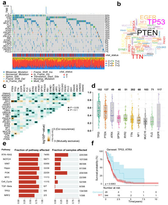 Mutational profiles across TCGA-GBM cases. (a) Oncoplot displaying the top 20 most recurrently mutated genes per variant class. (b) The gene cloud shows the total number of samples of each mutated gene as a proportion of the total number of mutations, and the size of each gene is proportional to the total number of samples in which it is mutated. (c) The correlation graph shows the mutually exclusive or coexisting status of the most mutated top genes. The green color is for mutated genes that tend to coexist; the yellow color is for mutually exclusive genes, and the shade of color indicates the significance. (d) Variant allele frequency (VAF) distribution in mutants (box plot). (e) Top 10 significantly enriched oncogenic pathways with sample prevalence rates. (f) Prognostic impact of mutant gene sets (KM analysis).