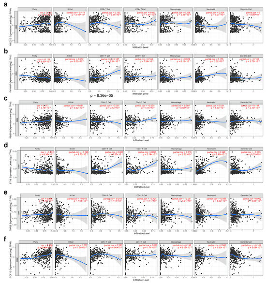 Correlation analysis of gene tagging with tumor purity and immune cell infiltration in GBM cancer: (a) MEOX2, (b) PHYHIP, (c) RBBP8, (d) ST18, (e) TCF12, and (f) THRB. Each black dot represents a case.