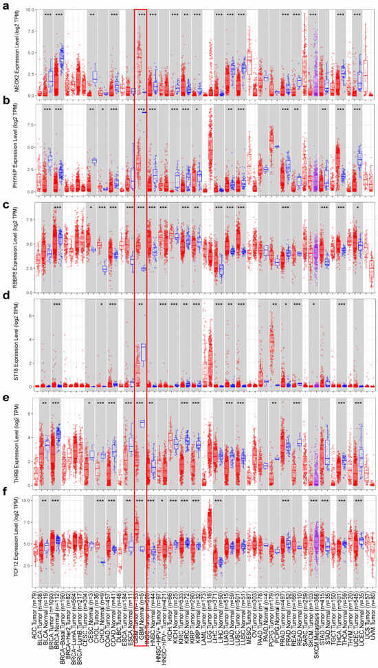 Differential expression of genes between normal and cancerous tissues (a) MEOX2, (b) PHYHIP, (c) RBBP8, (d) ST18, (e) TCF12, and (f) THRB. The red rectangular box shows the gene expression in GBM tumor tissue and normal tissue. * p < 0.05, ** p < 0.01, *** p < 0.001.