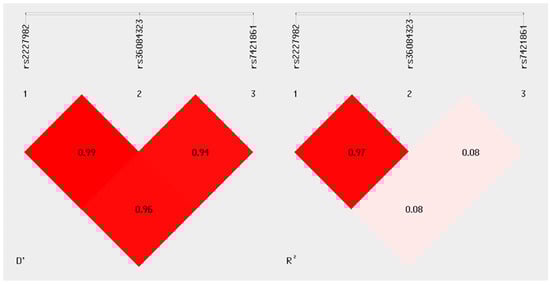 Linkage disequilibrium analysis. The graph was generated using SHEsis Plus software. The left panel shows the D’ values for each pair of variants, while the right panel displays the corresponding R2 values. A nearly complete LD (D’ > 0.94) is observed among the three analyzed polymorphisms, with a strong allelic correlation found only between rs2227982 and rs36084323 (R2 = 0.97), indicating a high likelihood of co-inheritance between these two alleles.