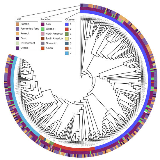 To investigate the phylogenetic relationships among the L. plantarum strains, a phylogenetic tree was constructed on the basis of the core genome, and the strains were grouped into seven different clusters (Figure 1). Three larger clusters were observed in the phylogenetic tree, consisting of 188 genomes in cluster 1, 82 genomes in cluster 7, and 39 genomes in cluster 2. From a host perspective, these three larger clusters included the strains from all five specific hosts included in this study, indicating no preference for any particular host (Supplementary Figure S1). From a geographical perspective, strains from other continents were distributed sporadically across the three larger clusters. This suggests a wider distribution of these genetically related strains. Additionally, there were no obvious associations between the host and the cluster, potentially because of the frequent transmission among various origins.