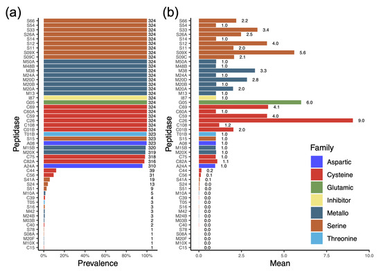 In microbes, peptidases are crucial enzymes that degrade proteins to acquire nutrients, process essential cellular components, and often play key roles in virulence, the stress response, and environmental adaptation. A total of 51 different protease families distributed across seven protease types were detected in the L. plantarum genomes (Figure 4a). Metallo-, serine- and cysteine-peptidases were common members of the L. plantarum genome. Among these three peptidases, there were eight, nine, and six families found in the metallo-, serine-, and cysteine-type peptidases, respectively. These may be essential components of the L. plantarum genome. Moreover, the inhibitor I87 was detected in all L. plantarum genomes. Interestingly, the average number of copies of C26 per L. plantarum genome was 9.0 (Figure 4b), which is often involved in the turnover of folyl poly-gamma-glutamates.