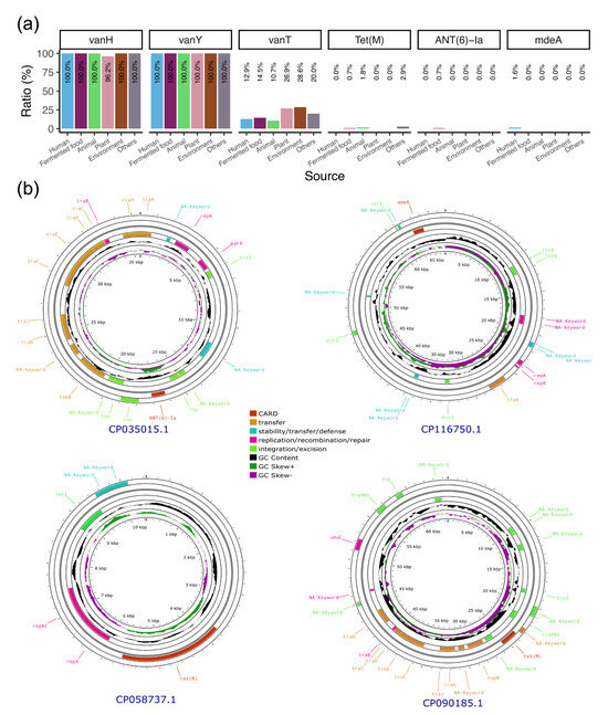 As probiotics, biosafety is an important aspect that should be considered. Therefore, we first scanned the genomes for virulence factors and found no positive hits. We then explored the ARGs harbored in the genome and identified a total of six ARGs. Two of these (vanH and vanY) were found in almost all strains, except for those from the plant-related samples, of which the percentage of vanH-positive strains was 96.2% (Figure 6a). Another ARG, vanT, which confers vancomycin resistance, was present in 10.7% of the animal-derived strains and in 28.6% of the environmental strains. In addition to the vancomycin resistance genes, the Tet(M), ANT(6)-Ia, and mdeA genes, which mediate tetracycline, aminoglycoside, and multidrug resistance, respectively, were also identified in these strains.