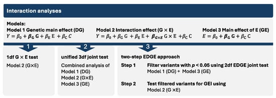 There are many existing statistical approaches to detect GEI and interpreting the results from statistical models for GEI can be challenging. Thus, we employed three complementary strategies as implemented in GxEScanR for detecting and interpreting GEI in this study (Figure 1). The first approach used the standard 1 degree-of-freedom (1df) G × E test from a model with both gene and environment main effects and their interaction. While the 1df G × E test is the easiest to interpret, it has the lowest power. The second approach was a unified 3df joint test of the main genetic effect (DG) from a model without an interaction, the same G × E effect as the first approach, and the gene–environment (GE) association. Since the 3df joint test combines these components, it does not distinguish which one is driving the association. Hence, we conclude the presence of a GEI effect if the 1df G × E test and/or if the GE association test in cases but not in controls has a p < 0.05. The 3df test is powerful to detect signals by any combination of the three components; however, when the true effect is driven only by one component, the power to detect is reduced. Lastly, our third approach, called the two-step EDGE approach, uses a 2df joint test of DG and GE to screen variants, followed by a test for the same G × E effect as the first approach. This two-step EDGE approach ultimately tests the same effect as the first approach, but with more statistical power, as the filtering step reduces the total number of tests in step 2. However, SNPs with weak marginal genetic or environmental effects may lead to missed true interactions [23,24,25].