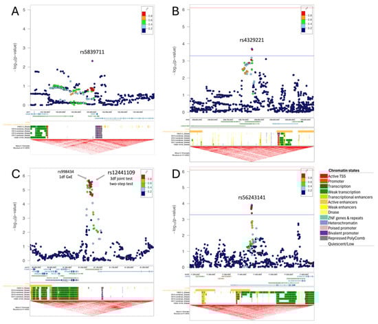 Regional plots for the main findings with maternal smoking (top) and maternal vitamin intake (bottom). The regional plots depict the genomic location of the identified variants (lead variant as purple diamond) in respect to nearby genes, the craniofacial-specific enhancers (CFSE) and the topologically associated domains from UCSC genome browser track. For (A) rs5839711 at FEZF1, which was identified via the 3df test, we display the –log10 of the p-values from case-only analysis. For (B) rs4329221-T, (C) rs12441109-G, and (D) rs56243141, we report the –log10 p-values from the 1df G×E test. For (B,D), which were identified via two-step testing, we provide the significance (red) and suggestive (blue) threshold for the second step. The regional plot for the locus at SV2B (C) depicts, in addition to the main finding rs12441109-G via the 3df test and two-step test, the lead variant rs998434-T from the 1df G × E test. The colors of the variants indicate their correlation (r2) with the lead variant. The chromatin states of CFSE are color-coded at each developmental time point (Carnegie Stage [CS] 13 through CS20) as shown on the right.
