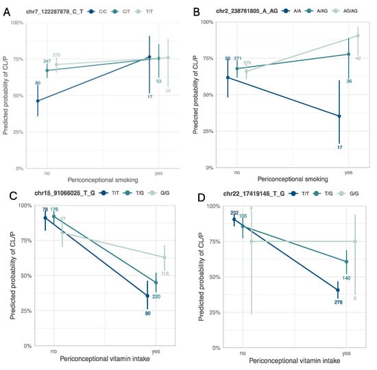 To evaluate and interpret the detected GEIs, we used interaction plots and visualized the predicted probabilities stratified by environment and genotype. The predicted probabilities were estimated using a logistic regression model, incorporating the genotype, maternal exposure status, and their interaction term.