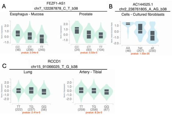 To determine whether the lead variant had a regulatory effect on the gene expression and its potential relevance, we looked up in the publicly available Genotype-Tissue Expression (GTEx Release v8, accessed on 14 September 2024 [30]) database if the lead variant was associated with gene expression (eQTL) or alternative splicing (sQTL) and retrieved their single tissue violin plots from the interactive data portal.