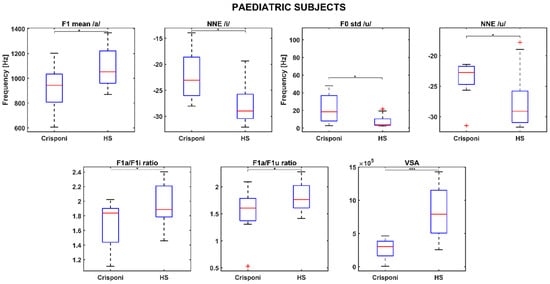 Boxplots for significant phonatory and articulatory parameters in the pediatric population. A (*) refers to a difference < 0.05, whereas (***) refers to a difference < 0.001. Statistical significance was estimated by a Mann–Whitney U test and reported accordingly: * p ≤ 0.05; *** p ≤ 0.001. HS = healthy subjects; NNE = normalized noise energy; VSA = vowel space area.