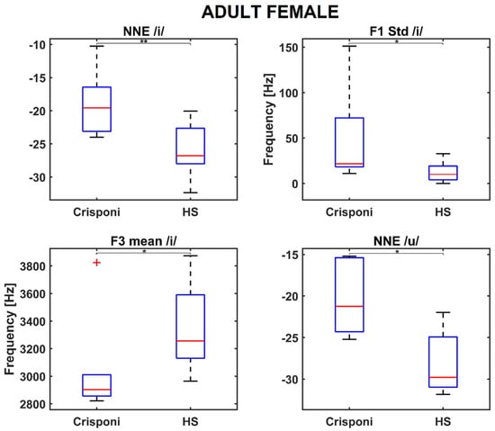 Boxplots for significant phonatory and articulatory parameters in the adult female population. A (*) refers to a difference < 0.05, whereas (**) refers to a difference < 0.01. Statistical significance was estimated by a Mann–Whitney U test and reported accordingly: * p ≤ 0.05. HS = healthy subjects; NNE = normalized noise energy.