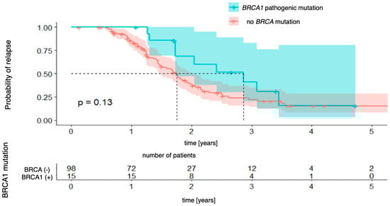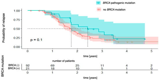 Figure 1 demonstrates the relationship between progression-free survival and BRCA mutation status (regardless of mutation type). The analysis did not reveal any statistically significant differences between patients with and without the mutation (χ2 (1) = 2.65; p = 0.103), although there was a trend towards a more favorable prognosis in the group with the mutation. The 3-year probability of maintaining a progression-free status was 22% (95% CI [7.3–65.1%]) in the group with the mutation and 14% (95% CI [6.8–27.4%]) in the group without the mutation; however, the differences did not reach statistical significance.
