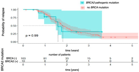 Next, the Kaplan–Meier curves were created for progression-free survival concerning the presence of BRCA1 and BRCA2 mutations, which were analyzed separately. For BRCA1 mutations (Figure 2), the analysis did not reveal any statistically significant differences between the groups (χ2 (1) = 2.30; p = 0.130). The 3-year probability of maintaining a progression-free state was almost identical in both groups, being 15% (95% CI [8.2–28.6%]) in the group without the mutation and 15% (95% CI [3.0–80.6%]) in the group with the mutation, with the vast confidence interval in the latter indicating a considerable uncertainty in the estimate. For BRCA2 mutations (Figure 3), there was also no significant difference (χ2 (1) = 0.01; p = 0.990). The 3-year progression-free survival was 25% (95% CI [16.7–37.2%]) in the wild-type group and 31% (95% CI [10.1–96.2%]) in the mutation-positive group.