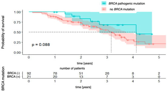 Subsequent Kaplan–Meier survival curves were generated for BRCA mutation status (BRCA pathogenic mutation vs. no BRCA pathogenic mutation). The analysis did not reveal a statistically significant difference in overall survival between patients with and without the mutation [χ2 (1) = 1.92; p = 0.088]. However, there was a clear trend toward a better prognosis in the mutation-positive group. The 4-year survival probability in this group was 68% (95% CI [48.0–96.8%]), whereas in patients without the mutation, it was estimated at 31% (95% CI [19.7–48.0%]). This difference did not reach statistical significance, but the divergence of the curves suggests that BRCA mutation status may be associated with better long-term survival (Figure 4).