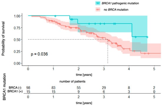 Our study did not reveal any statistically significant differences in PFS between patients with and without the BRCA mutation. There were also no differences in separate analyses differentiating for BRCA1 and BRCA2 mutations compared to the non-BRCA population. As for overall survival, the study did not reveal a statistically significant difference in overall survival between patients with and without the mutation. Upon separate analysis, in the case of the BRCA1 mutation, a significant difference in overall survival was observed between patients with and without the mutation (p = 0.036). The four-year probability of survival in patients with a BRCA1 mutation was as high as 84% (95% CI [64.9–100.0%]), while in the group without a mutation, it was estimated at 30% (95% CI [19.6–47.2%]). For the BRCA2 mutation, the differences did not reach statistical significance.