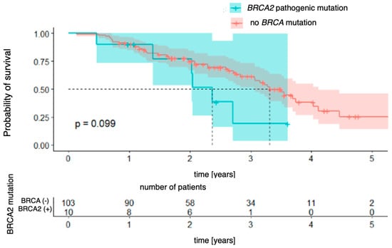 The relationships with the occurrence of BRCA1 and BRCA2 mutations were analyzed successively. In the case of the BRCA1 mutation (Figure 5), a significant difference in overall survival was observed between patients with and without the mutation [χ2 (1) = 4.41; p = 0.036]. The four-year probability of survival in patients with a BRCA1 mutation was as high as 84% (95% CI [64.9–100.0%]), while in the group without a mutation, it was estimated at 30% (95% CI [19.6–47.2%]). For the BRCA2 mutation (Figure 6), the differences did not reach the level of statistical significance [χ2(1) = 2.73; p = 0.099], but the direction of the effect indicated a worse prognosis in patients with this mutation.