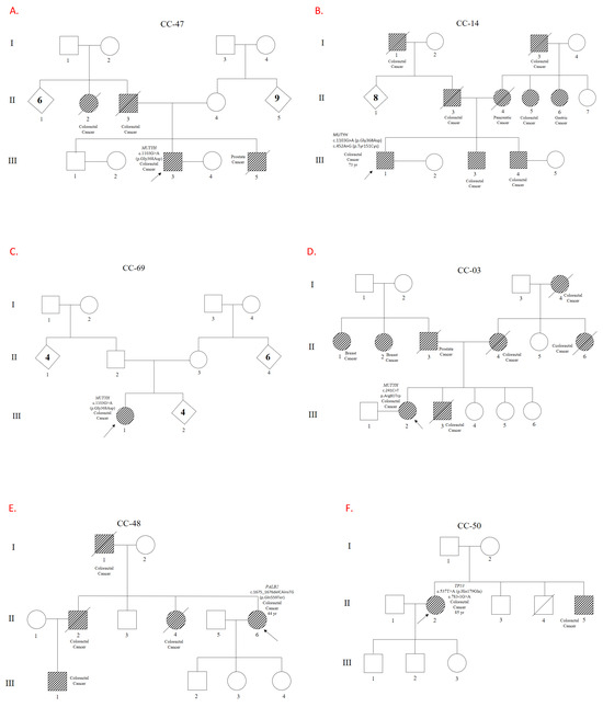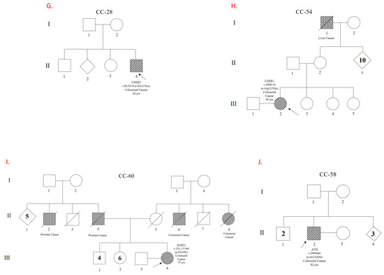 Genealogical trees showing families and patients carrying Pathogeic/Likely Pathogenic variants. Pedigrees of the patients and their families are shown. Panels (A–D) illustrate variants in the MUTYH gene. Panel (E) shows a variant in PALB2, and Panel (F) in TP53. Panels (G,H) depict variants in CHEK2, while Panels (I,J) correspond to variants in BARD1 and ATM, respectively. Codes beginning with ‘CC’ refer to individual patients and their families. The relevant gene and variant descriptions can be found next to each patient symbol.