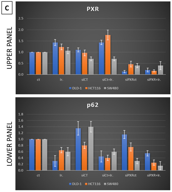 In our experiments, the inhibition of autophagy by HCQ, which alters endosomal transport and autophagosome–lysosome fusion, leads to a reduction in PXR expression and inhibition of PXR translocation from cytoplasm to the nucleus. On the other hand, autophagy induction through inhibition of the PI3K/AKT/mTOR signaling pathway increased the subcellular localization of PXR in the nucleus. Thus, if we combine these data with the reduction in mtKRAS CRC cell viability after the silencing of PXR and treatment with Irinotecan, we conclude that autophagy could act as a protective mechanism through PXR induction for mtKRAS CRC cell lines against this chemotherapeutic agent.
