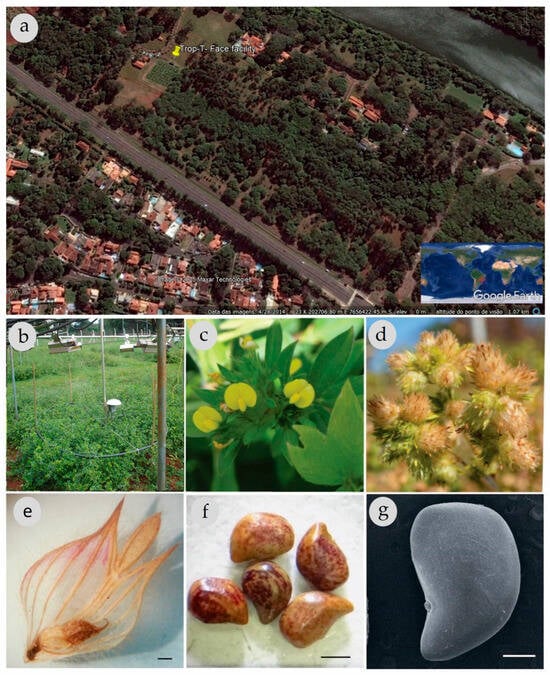 (a) Trop-T-FACE facility of the University of São Paulo, campus of Ribeirão Preto, SP, Brazil (Source: Historical image in Google Earth Pro. Accessed on 14 June 2025). (b) Detail of the infrared lamps and CO2 ring in the Stylosanthes capitata field experiment. (c) Papilionate flowers with yellow corollas and inflorescences. (d) Mature plants of S. capitata in the field (harvest stage). (e) Pods fixed to the bract extracted from mature inflorescences (4× magnification). (f) S. capitata healthy seeds extracted from pods. (g) scanning electron microscopy of S. capitata seed. Scale bars: (e,f): 1 mm, (g): 500 µm.