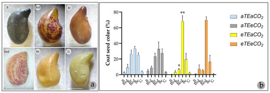 (a) The color classes of the integument of S. capitata seeds are classified as: B = black; Brd = brown with dots; Br = brown; Bed = beige with dots; Be = beige; G = green. Scale bar: 1 mm (1.25×, Leica S4E Microscope, Leica Microsystems GmbH, Wetzlar, Germany). (b) Mean values of seeds in each coat color class in each maternal treatment in comparison with control (aTEaCO2) (* p < 0.05; ** p < 0.01, Šídák multiple comparisons test).