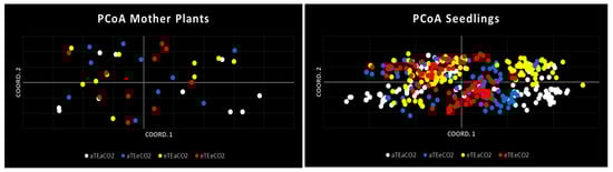 These moderate effect sizes reflect a biologically meaningful shift in genotypic composition, reinforcing that elevated temperature can shape progeny-level genetic diversity even in the absence of strong directional selection. In contrast, CO2 concentration and its interaction with temperature had no significant impact on any parameter (p > 0.24; η2 < 0.05) (Table 4 and File S2—Table S10), indicating that elevated CO2 within the tested range did not affect genetic diversity outcomes.
