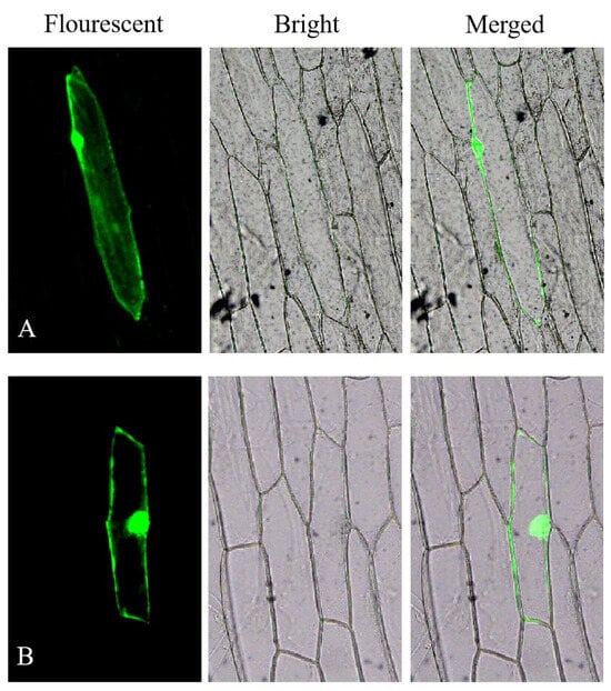 According to the methods reported in our previous study [], the 35S-KS-eGFP plasmids were attached to gold particles, with the empty 35S-eGFP vector serving as a control. Onion bulbs were bombarded with a helium biolistic gun (Bio-Rad, USA) and incubated for another 24 h in the dark at 28 °C. The localization of the ArKS protein within subcellular compartments was assessed by utilizing GFP as a reporter. Onion epidermal cells were infiltrated with bacterial cells containing KS-GFP plasmids. The fluorescence signal was observed using a confocal microscope (Olympus BX63, Toyko, Japan).