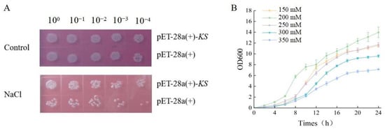 Another experiment was liquid culture: cell growth with the vector pET-28a(+)—KS under 150, 200, 250, 300, and 350 mM NaCl was monitored by measuring the absorbance at OD600 [].