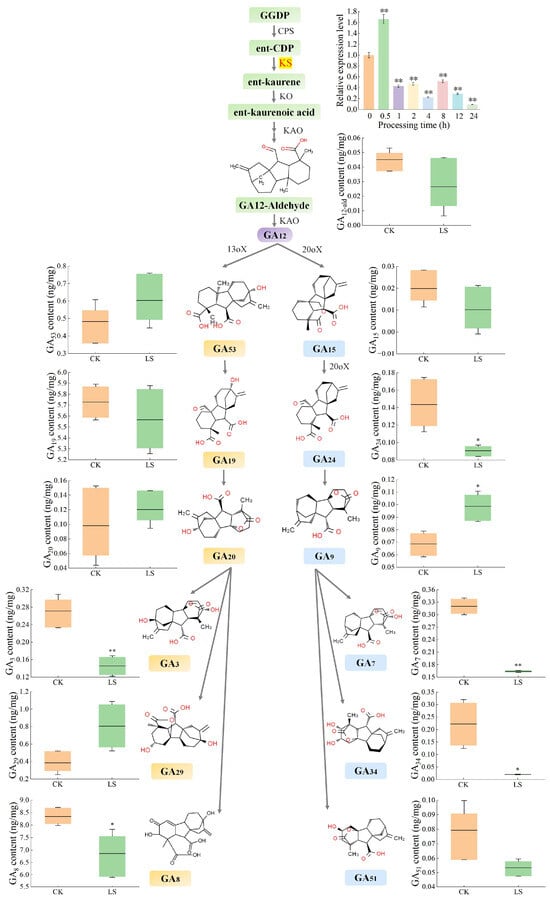 The enzymes of KS and their encoding genes have been successfully identified and characterized in many other plants, such as Cucurbita maxima Duchesne ex Lam.(C. maxima), Camellia sinensis cv. Baihaozao (C. sinensis), Scoparia dulcis L. (S. dulcis), Oryza rufipogon Griff. (O. rufipogon), and Picea glauca (Moench) Voss (P. glauca) [,,,,]. The KS gene of C. sinensis exhibited high expression in tender stems and roots, as well as many other tissues that are rapidly growing. This tissue-specific expression suggests the role of this phytohormone in providing precursors necessary for regulating tissue growth and development []. Compared with the wild type, the expression level of the KS gene and the content of gibberellin in the mutant cabbage were lower than those in the wild type [].