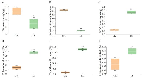 Levels of GAs in A. roxburghii under normal conditions, as well as under NaCl stress. CK refers to non-inducing conditions; LS indicates NaCl stress after 15 days. ‘*’ and ‘**’ indicate significance compared to the control at the 0.05 and 0.01 levels, respectively.