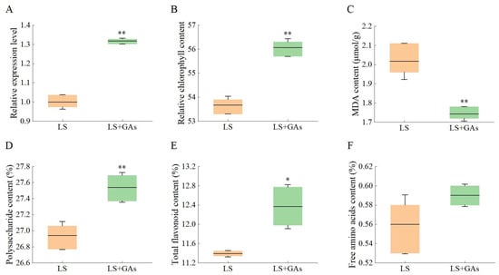 The relative expression levels of KS, relative chlorophyll, MDA, and active ingredient content under salt stress with exogenous GA compensation from A. roxburghii. (A): The relative expression levels of KS; (B): The relative chlorophyll content; (C): The contents of MDA; (D): The contents of polysaccharide; (E): The contents of total flavonoids; (F): The contents of free amino acid. The orange box is for the NaCl stress; the green box stands for the NaCl stress with GAs. ‘*’ and ‘**’ indicate significance compared to the control at the 0.05 and 0.01 levels, respectively.